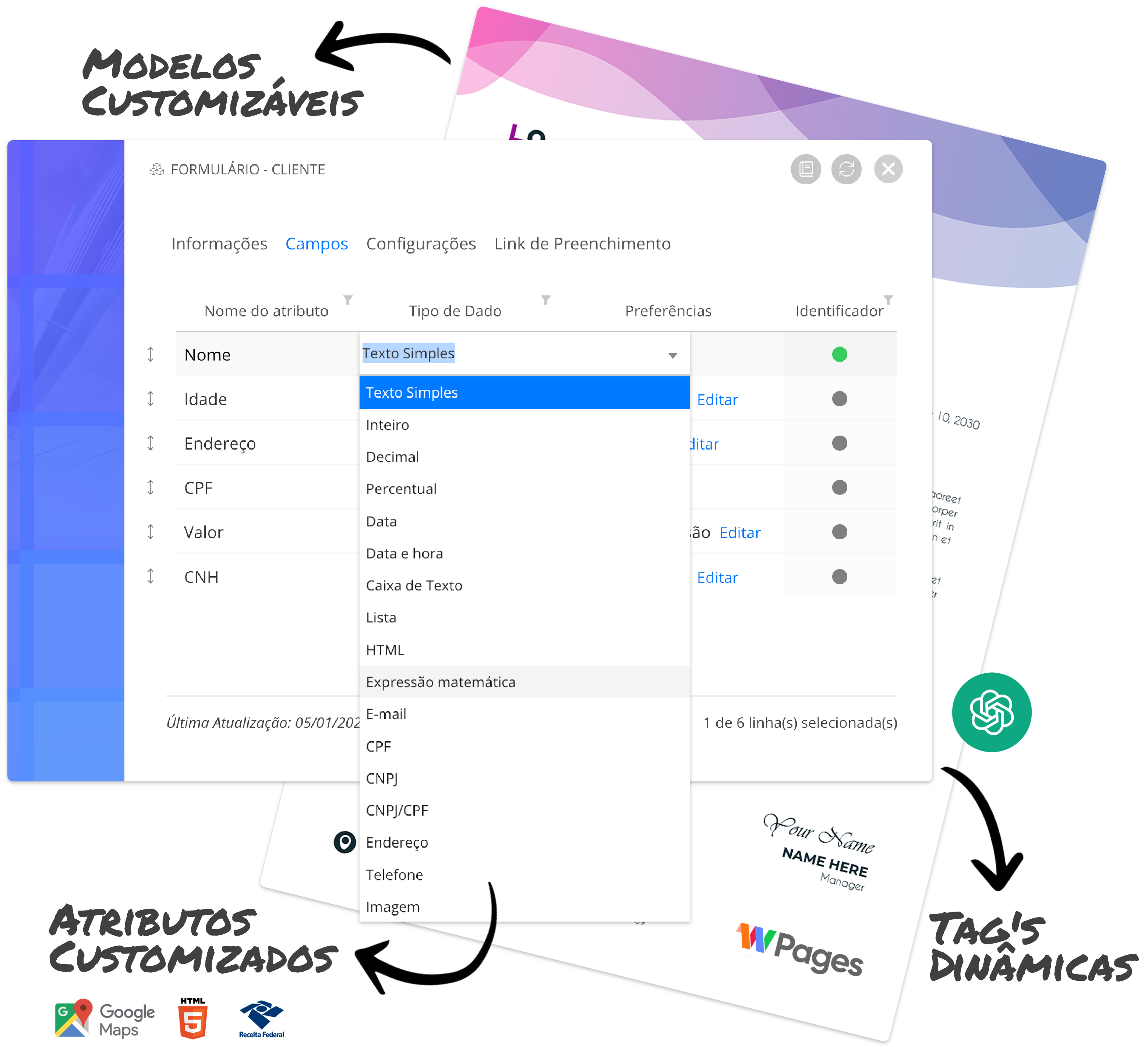 Crie campos inteligentes e personalizados para gerar qualquer documento em segundos: contratos, laudos, certificados. Tudo do jeito que o seu negócio precisa — sem limites.