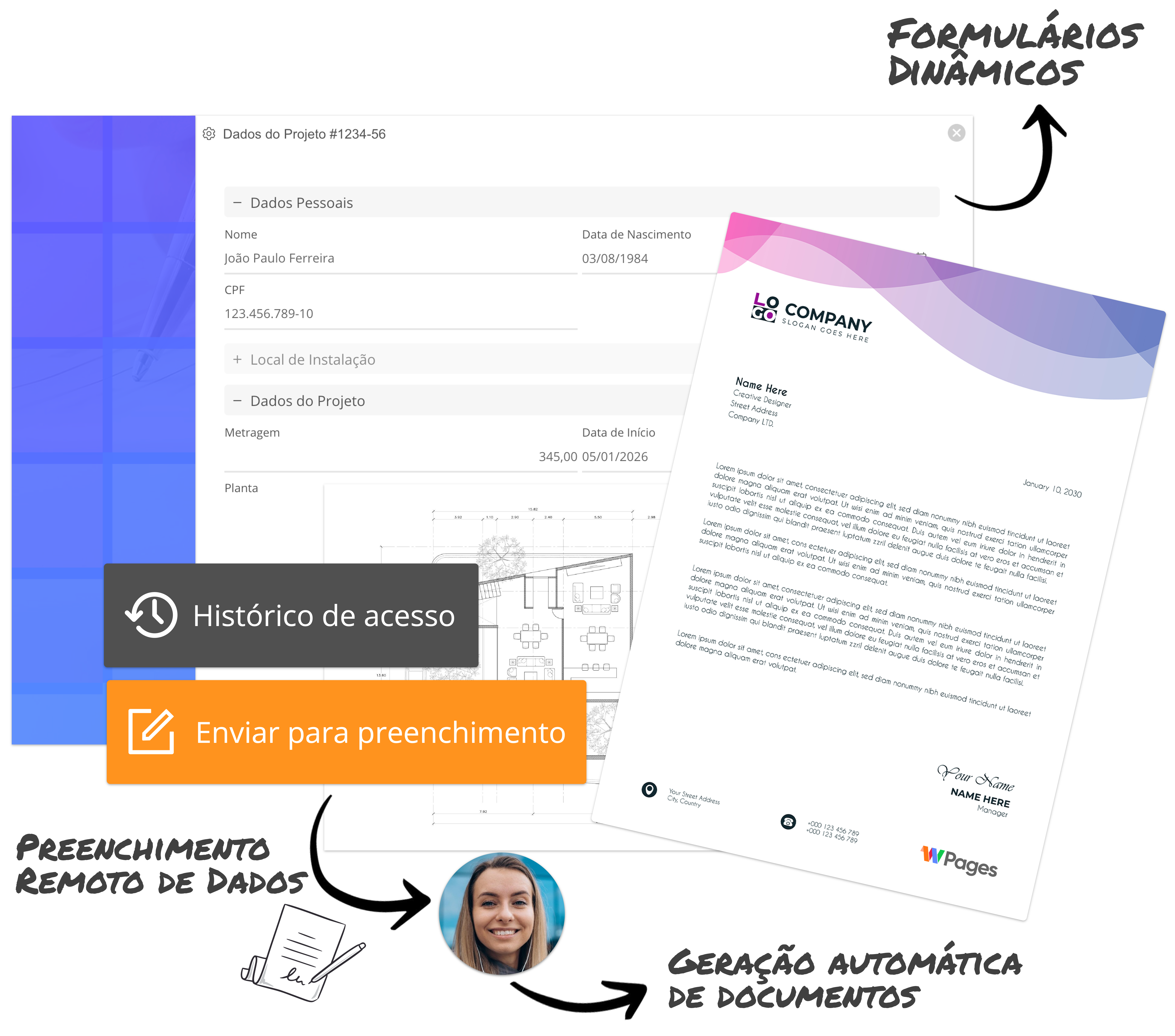 Disponibilize formulários para preenchimento remoto, colete dados e crie documentos automaticamente de forma organizada e 100% online.