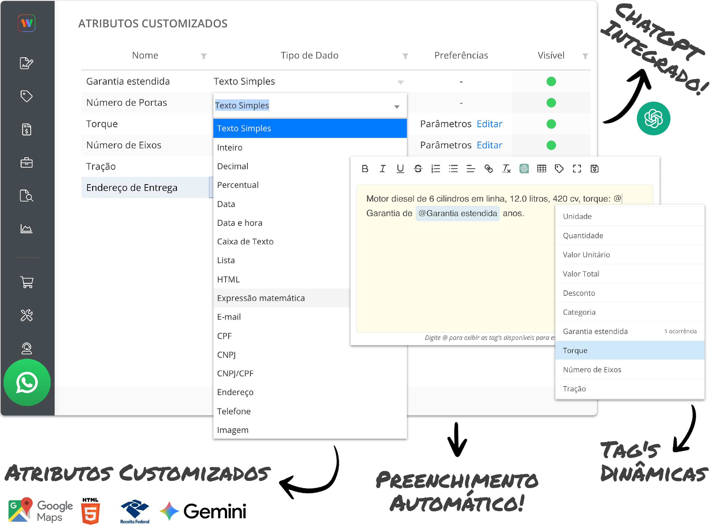 Crie campos customizados com tipos de dados específicos: inteiro, decimal, moeda, área, volume, data, texto e muito mais. Configure sua proposta exatamente como seu negócio precisa, sem limitações.